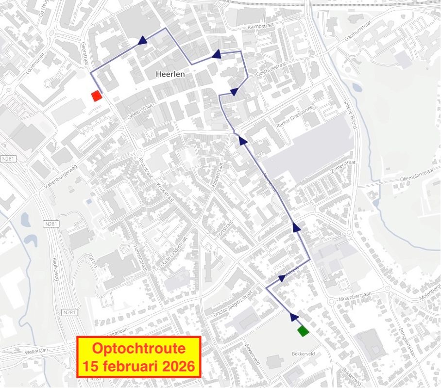 Start optocht: Vlotstraat – Akerstraat – Pancratiusplein – Pancratiusstraat – Bongerd -Saroleastraat – Van der Maessenstraat – Schinkelstraat – Burgemeester van Grunsvenplein.