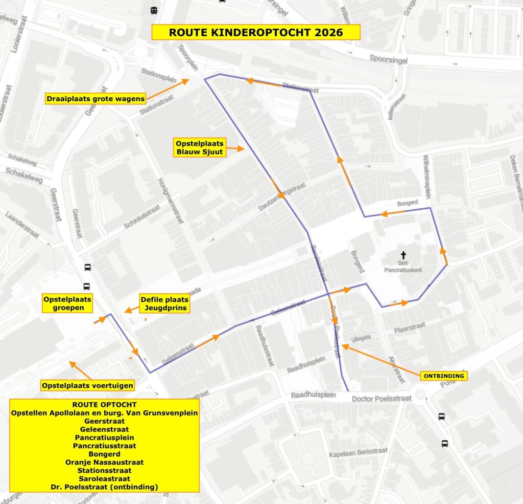 Start optocht: Geerstraat – Geleenstraat – Pancratiusplein – Pancratiusstraat – Bongerd – Oranje Nassaustraat – Stationstraat – Saroleastraat – Geleenstraat – Pancratiusplein Zuid – Gasthuisstraat (ontbinding).
